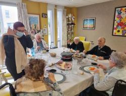 Les participants se sont réunis autour de la table afin de prendre le repas ensemble. Ce format en petit groupe a permis aux résidents de manger autrement que dans le cadre habituel, tout en étant entourés de personnes différentes. Chacun a ainsi pu prendre la parole plus facilement, aborder divers sujets, évoquer des souvenirs, raconter des anecdotes ou simplement écouter les autres.