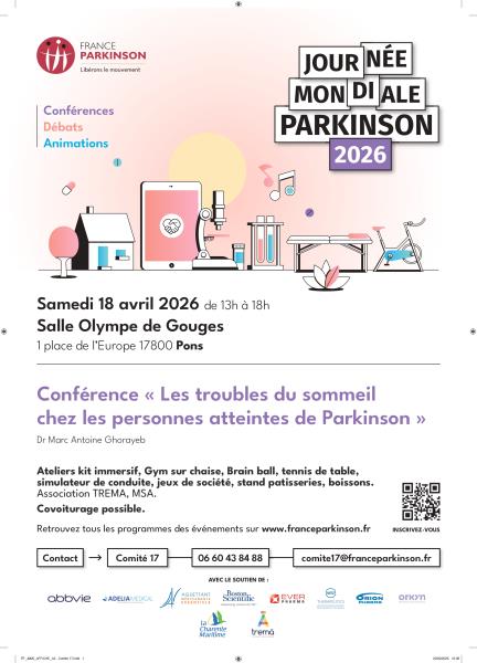 Dans le cadre de la Journée Mondiale Parkinson, le Comité 17 organise divers ateliers et propose une conférence sur "les troubles du sommeil chez les personnes atteintes de Parkinson", le :